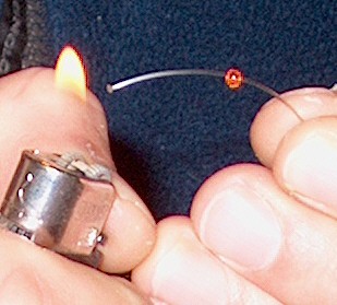 Das Monofil wird erhitzt, bis sich eine Schmelzperle bildet. Diese wird sofort gegen einen kalten Gegenstand, z.B. Bindestock gedrückt, so dass sich ein kleiner Teller aus Monofil bildet. Dieser Teller reicht als Deckel für den Parachute aus, fällt überhaupt nicht auf und ist sehr gewichtssparend.