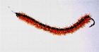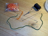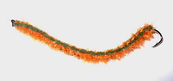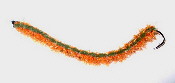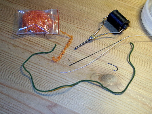 Hier sind die erforderlichen Bindeutensilien zu sehen, ein einfacher vernickelter Wurmhaken mit abgeknipstem Öhr und angelegten Widerhaken, deren Unebenheit der anzuwindenen Geflechtröhre besonders guten Halt gibt, Geflechtröhre, Bindefaden 6/0 schwarz, dunkelgrünes Chenille, oranges Flash-Chenille