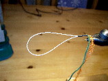 Die Schlaufe ist hier nicht ganz zugezogen, so dass zu sehen ist, dass der grüne Faden über und der orange Faden unter dem Haken liegt.
