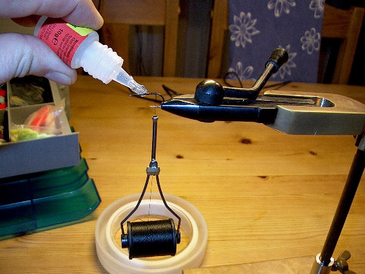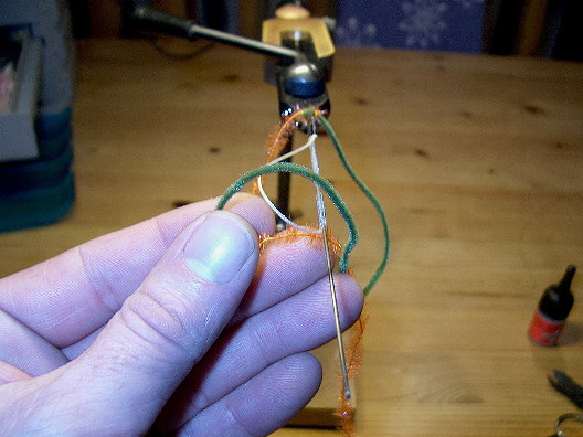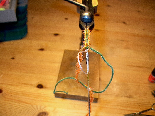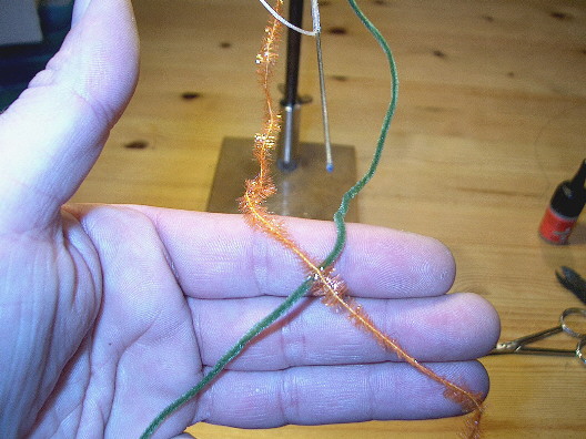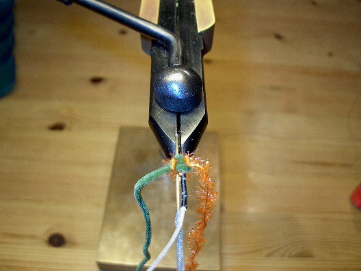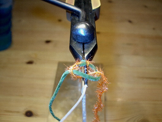 Die Geflechtröhre wird auf die noch klebstofffeuchte Grundlage gewunden, der Bindefaden wird bis zum Hakenbogenbeginn gewunden und die beiden Chenillefäden eingebunden. Der Bindefaden wird mit ein paar halben Schlägen gesichert und abgeschnitten.