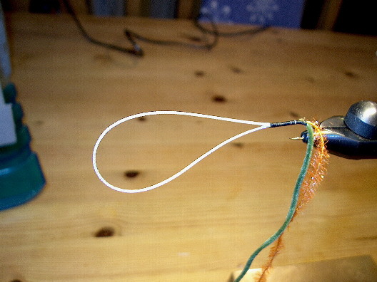 Dadurch bildet sich bei diesem Chenillefaden eine Schlaufe, die über den Haken geführt wird.