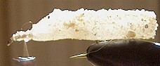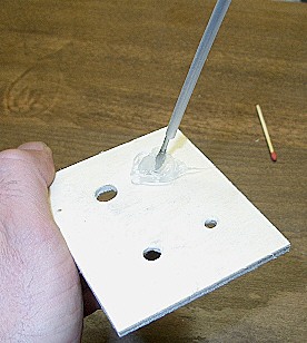 Das Loch in der Holzplatte, durch das der Silikonschlauch locker durchpasst, wird ausgesucht und dort Silikon plaziert.Dann wird der Silikonschlauch hin und her bewegt, bis er gleichmäßig mit Silikon bedeckt ist.
