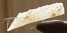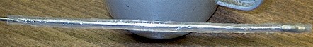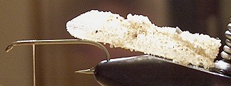 Den fertigen Schlauch abreiben, der meiste Sand bleibt kleben. Dann gewünschte Länge mit dem Seitenschneider schräg abknipsen, mit dem Haken durchstechen, drüberschieben und so belegen, dass oben eine Öffnung verbleibt.