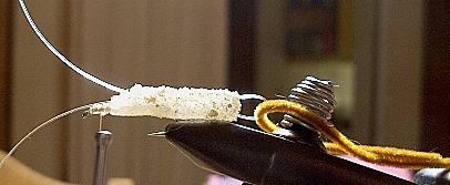 Monofilschlaufe durch die Öffnung stecken und Chenille mit gewünschter Larvenfarbe durchziehen.