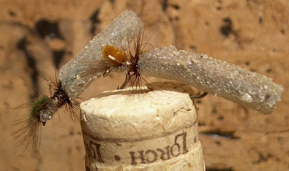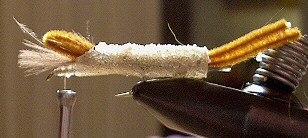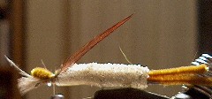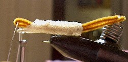 Von vorne eine CDC reinstecken (das sind die Beinchen), CDC und Chenille belegen und am Köcheranfang eine kleine Hechel in gewünschter Farbe einbinden.