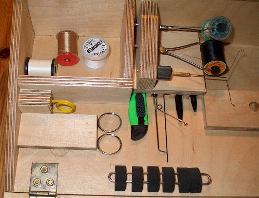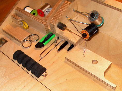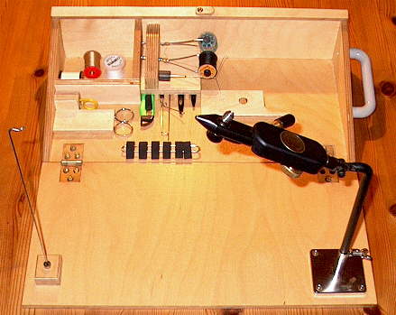 Bobbins, Schere, Hechelklemme, Whip-Finisher usw. sind verstaut und jederzeit griffbereit.