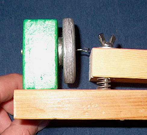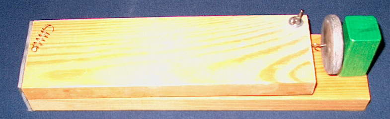 Aus einem Kugellager mit Achse (kostenlose Bezugsquelle gefällig?) und Lötzinn eine Schwungscheibe gießen und vorne einen gebogenen Draht mit eingießen. Die Achse in einen mit dem unteren Holz verschraubten Holzklotz einbauen (in Bohrung kleben) und auf dem oberen Holz noch eine kleine Feder befestigen. Fertig!