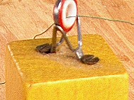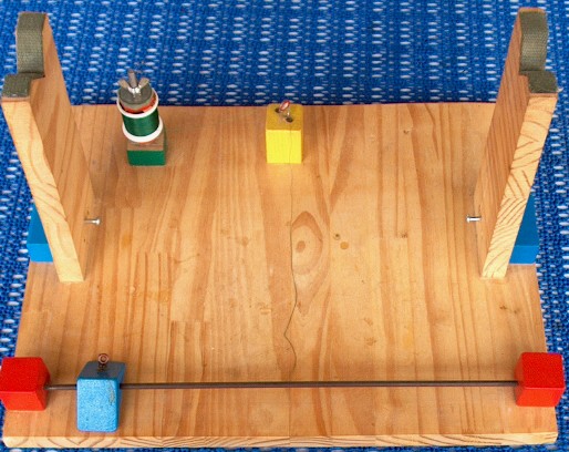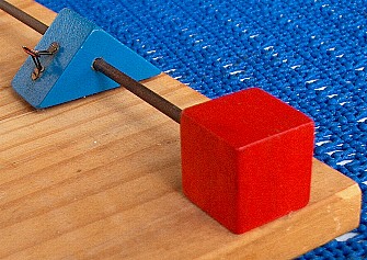 Das blaue Klötzchen ist dreieckig und ist beweglich auf einer Stahlstange gleitend.