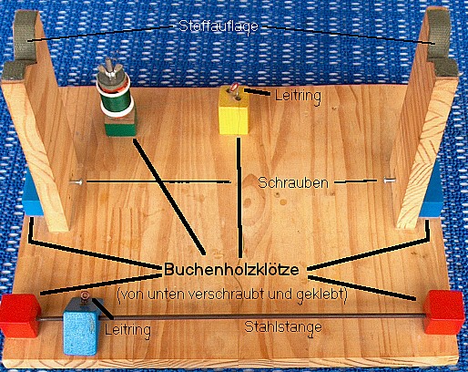 Die Stahlstange hält in Bohrungen der roten Klötzchen.