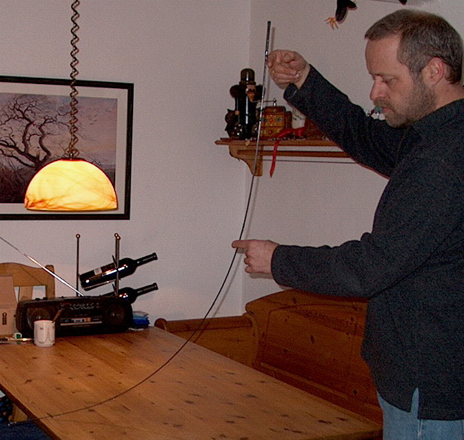 Tesafilm festgeklebt. Jetzt gehe ich mit der Rute auf die Wiese. Erst wird die Rute leer in Schwingungen versetzt. Wie man sieht, schwingt