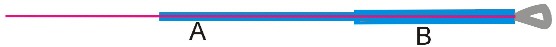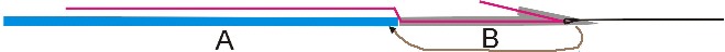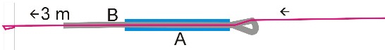 Das Geflecht wird gedanklich in das 2 m lange Stück A und das 1 m lange Stück B geteilt. An der Stelle, wo A und B sich treffen, soll die Schlaufe des Vorfachs entstehen.