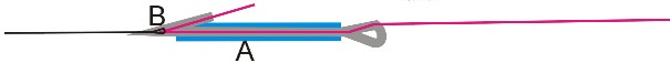 An der Stelle, wo A und B sich treffen, wird mit der Ködernadel Monofil eingeführt, das man am Ende des Geflechts ca. 10 - 20 cm austreten lässt.