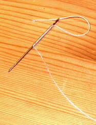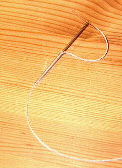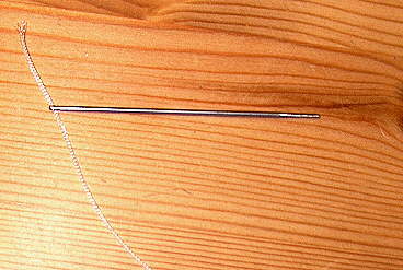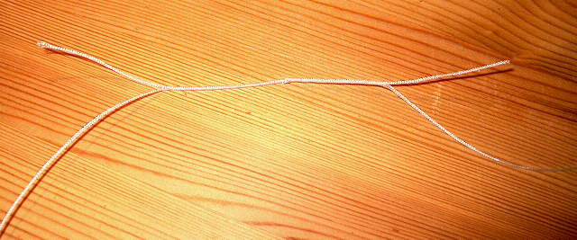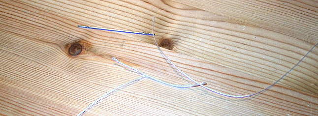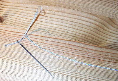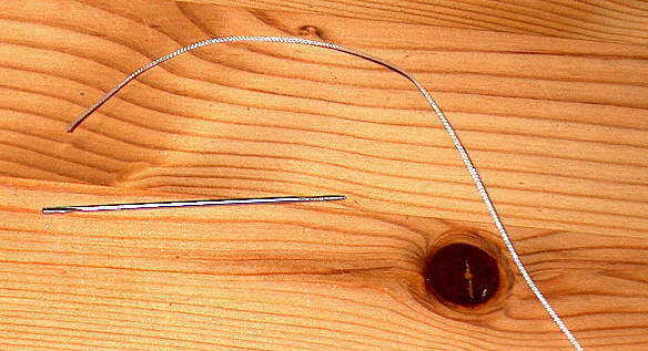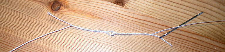Ausgangsmaterial ist eine stumpfe Nadel und Geflechtschnur (daraus sind u.a. auch Loop-on-Junctions), die man z.B. als Nachschnur der Fa. Jenzi kaufen kann. Man benötigt drei Stärken um die Abstufung zu erreichen.